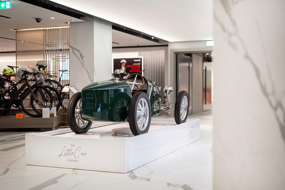 En estas semanas, los visitantes de Harrods pueden ver personalmente a este vehículo eléctrico construido a un 75% por ciento del tamaño de la Bugatti de Grand Prix, y quien decida comprarlo allí tendrá el beneficio adicional de poder visitar la fábrica donde se construyen los 500 ejemplares inicialmente proyectados de la Bugatti Baby II.