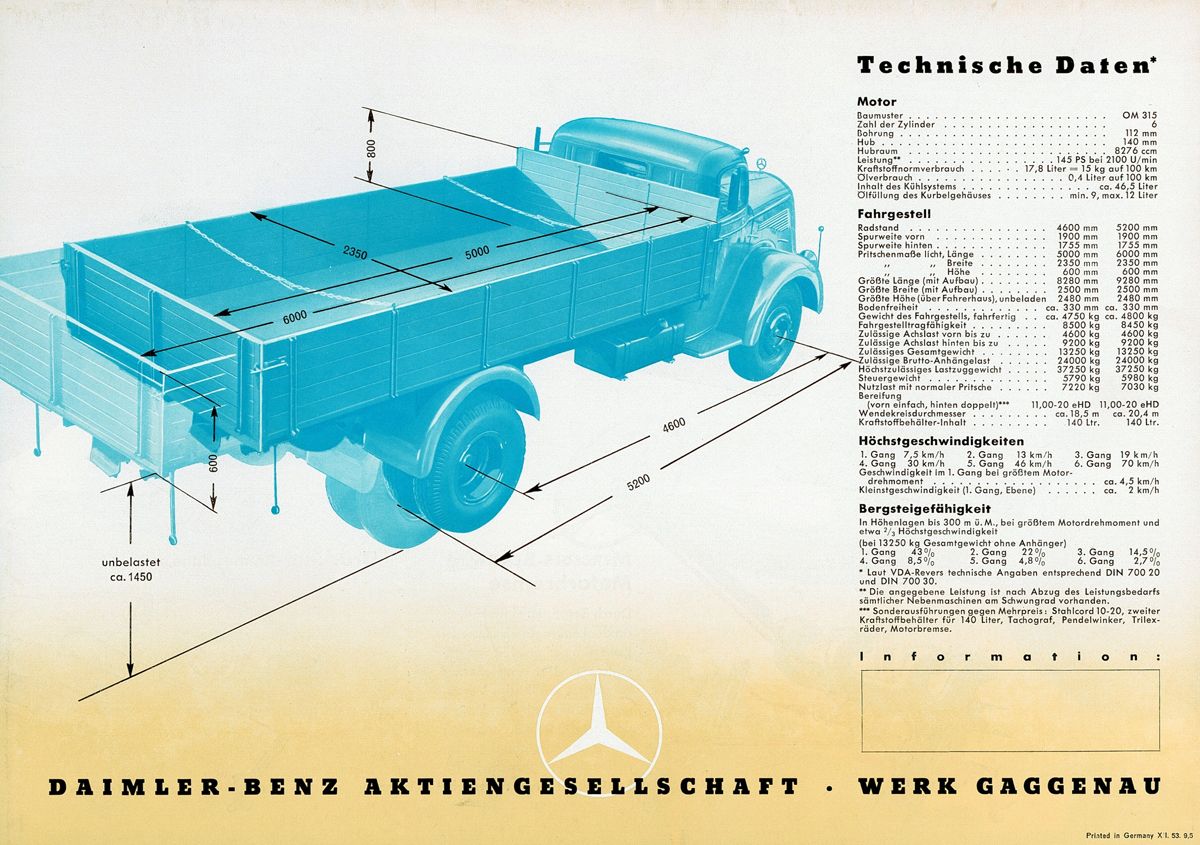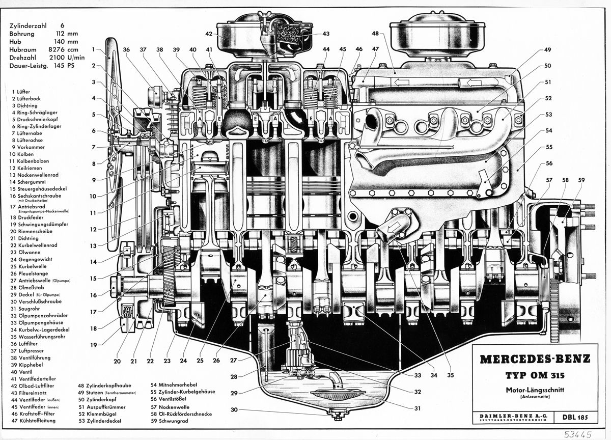 El por entonces jefe de desarrollo, el Profesor Fritz Nallinger, consideró la evolución del nuevo motor seis cilindros para el L 6600 «definitivamente un gran paso». Tan temprano como el año 1941, durante la Segunda Guerra Mundial, Mercedes-Benz ya estaba desarrollando y probando el motor Diesel de seis cilindros OM 304 que giraba a mayores rpm. Después de 1945, el desarrollo en el motor Diesel OM 315 continuó hasta que estuvo listo para la producción en Untertürkheim. Con 40.207 motores construidos desde 1950 a 1979, incluyendo unidades de reemplazo y estacionarios, el OM 315 fue muy exitoso en su categoría por décadas. Junto al OM 315 Standard, también se ofreció a la par el OM 315 V (110 HP) que aceptaba múltiples combustibles y era montado en el camión militar LG 315, construido de acuerdo a los requerimientos de la NATO; el OM 315 II con 125 caballos para exportación; así como el OM 315 A sobrealimentado de 180 caballos para vehículos de propósitos especiales y aplicaciones estacionarias.